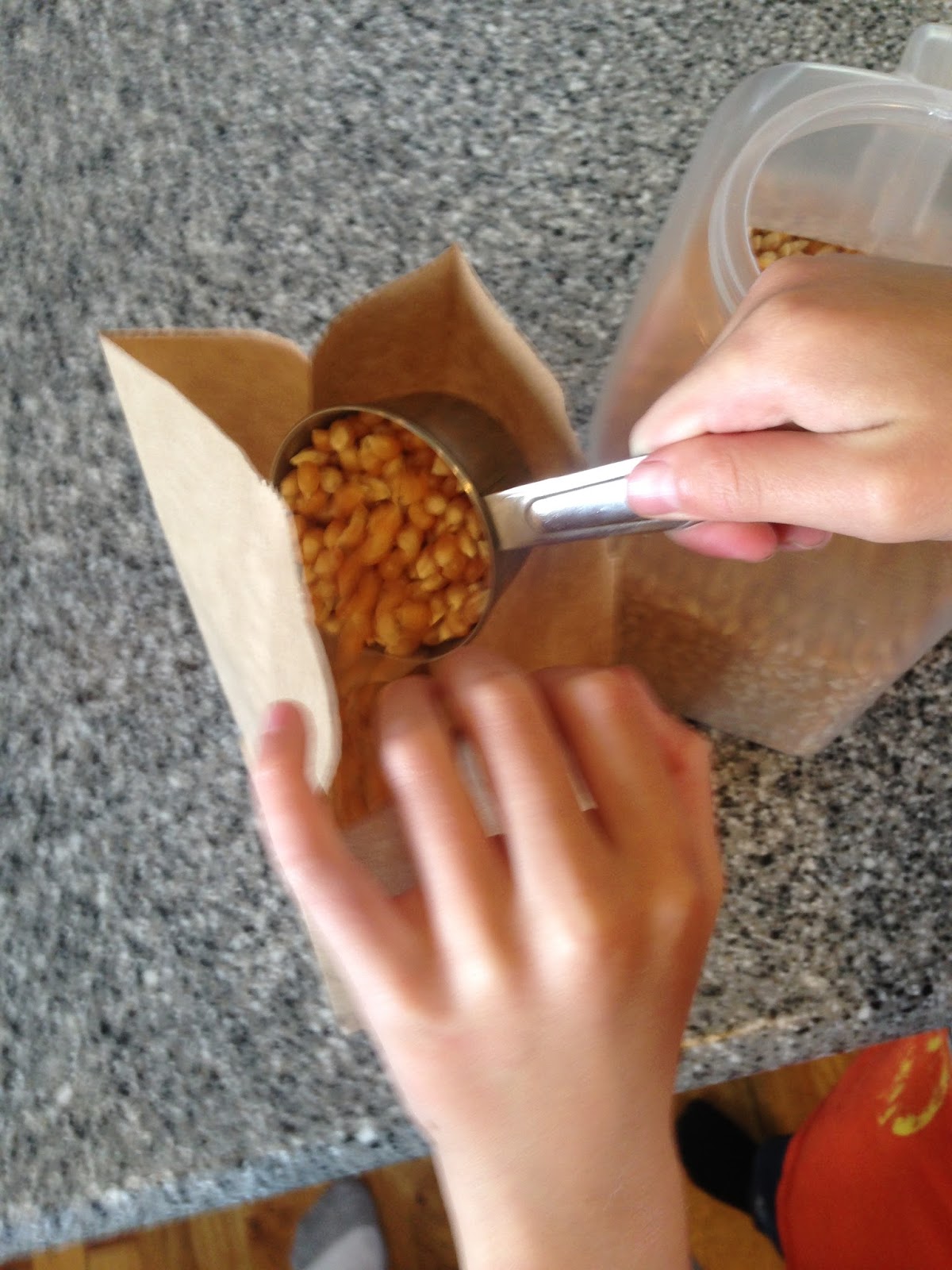 Add 1/3 c. of popcorn seeds to a brown paper bag: